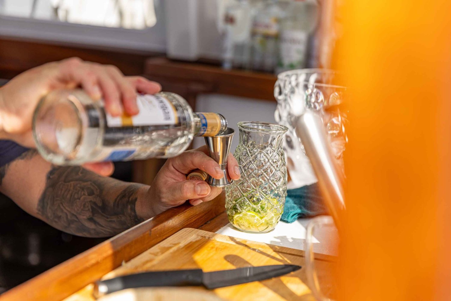 The boat has bar on board and toilet.